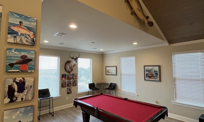 Beautiful 1800 square foot lodge located on the historic bayou La Loutre. Just step away from the lodge on bayou La Loutre is our dock facility that has a cleaning station and dock space to park your boats. The lodge was established in 2018, it has four bedrooms and 3 full baths and will accommodate 10 people. Spacious kitchen over looking living room with ajoing game room. Stunning view overlooking the beautiful south Louisiana marsh outside the back deck! The lodge has all the accommodations and amenities for cooking and your overnight stay. Just bring your food and drinks and enjoy a relaxing stay on the bayou!