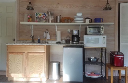 Private Entrance, Comfortable, 18'X36' Common Area, Kitchenette, and Dining Area. Includes: Kitchen Sink, Refrigerator, Ice maker, Microwave, Large Toaster Oven, Coffee Maker and Electric Tea Kettle. Private Bedroom and Bath. Memory Foam Queen Fold-Out Sofa in Common Area. Patio Includes: Glass Table with Four Chairs and Chimenea for Chilly Evenings. Plenty of Space to Park a Vehicle and Boat. Less than a Mile to River Launch. Well Behaved Kid and Dog Friendly. All Questions Cheerfully Answered:)
