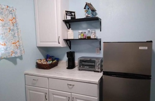 Our brand new tiny home has everything for a comfortable stay--kitchen with all the amenities, like coffee & tea fixins, snacks, toaster oven/air fryer, full fridge & freezer, hot plate, microwave, all the utensils, etc. It has a comfy queen-size memory foam bed, extra bedding & pillows, roomy shower, desk with lots of charging stations, dining table, reading chair that rocks with books to browse, closet with hangers, lighted makeup mirror & full-length mirror, blackout curtains. Owners live across the street, so you have privacy, but we're here if you need something.