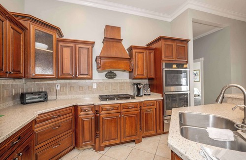 The kitchen is a dream, featuring stainless steel appliances, a Keurig for your morning brew, and ample counter space, including an island with seating for two. Enjoy casual meals at the dining table for six, or gather in the formal dining room for a more elegant setting. When it's time to wind down, the home’s spacious bedrooms provide a restful retreat, each equipped with room-darkening shades for a peaceful night’s sleep. With an inviting atmosphere, top-notch amenities, and an unbeatable location, The Bishops Manor is the perfect choice for your next vacation—offering comfort, entertainment, and relaxation all under one roof.