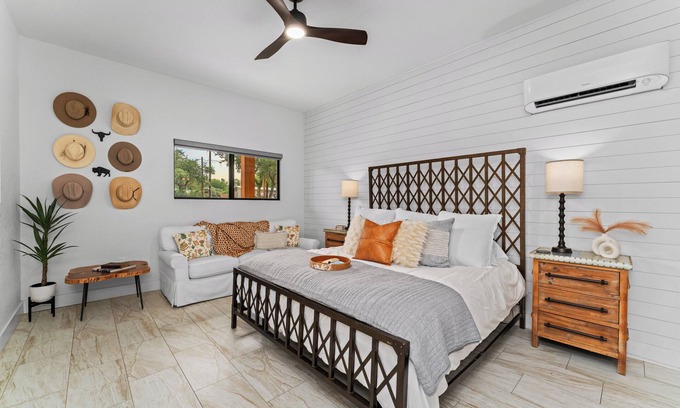 An elevated Hill Country escape, The Blakely is a private sanctuary designed for comfort and indulgence. Set in a peaceful, tucked-away location just steps from Bulverde’s charming downtown, this elegantly appointed suite offers a seamless blend of serenity and sophistication. Enjoy a private exterior entrance, a sumptuous king-sized bed, and a spa-inspired bathroom featuring an oversized soaking tub and shower combo. Unwind with a smart TV, premium linens, and your own stylish seating area. The suite also includes a thoughtfully curated mini kitchenette with a mini fridge, microwave, coffee station, and essentials for a refined stay. Step outside to your own private furnished patio and take in horses and farm animals next door.