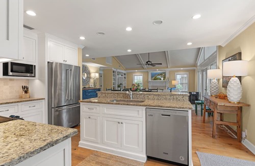 Family Room has comfortable seating with large TV and is open to the dining room, kitchen and access to the screened in porch. Just down the hall are the bedrooms and the Queen suite is located upstairs beyond the kitchen. A drip coffee maker and grill have been provided for your use.