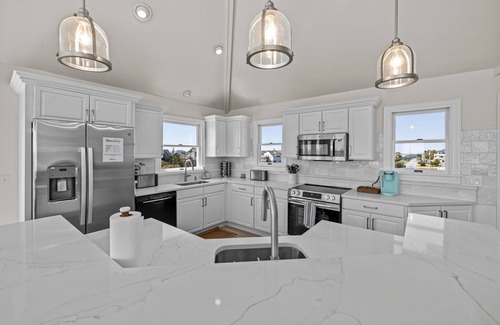 Cook a meal while not missing any of the fun, or the view of the beautiful blue ocean. The open concept kitchen has an expansive island and plenty of countertop space. This kitchen is fully equipped with assorted glassware, silverware, spatulas, cutlery, coffee makers (Keurig and Regular), toaster, blender, bakeware, pots and pans and more! You’re sure to have everything needed to enjoy meals at home while staying at The Blue Moon Beach House.