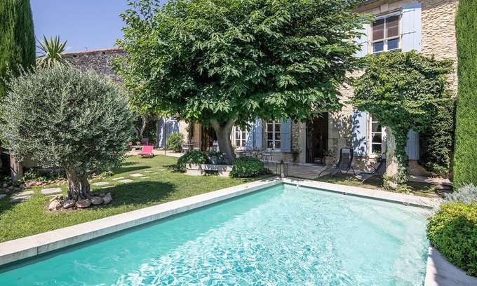 Stone townhouse exposed in Maillane in the center of the village, including a large, very bright living space thanks to its large openings overlooking the garden to the south and its superb swimming pool heated on demand.
