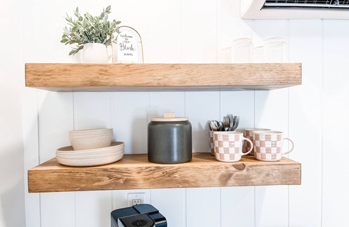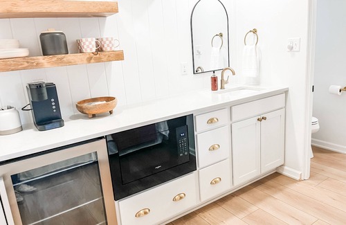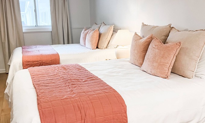 Like the flowers in the garden, this room is bursting with shades of blush! This 400 sq ft, double room sleeps four and has two queen beds, mini fridge, Keurig, and microwave. Accompanied by an area to sit and work or eat a simple lunch.