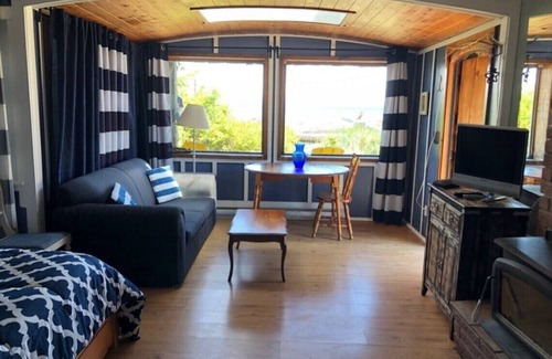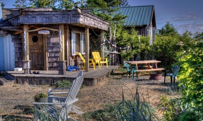 This is a cute, cozy, rustic beach house done up in a nautical theme, located directly on the beach. This cabin boast unobstructed ocean and mountain views from the entire living area as well as from the queen size bed made up with cozy bedding located in front of a wood burning stove. The dining area is located in an ocean view window with a couch to curl up on close by. The bedroom has a single over single bunk bed, the bathroom has a stand up shower, and the kitchen is fully stocked. There is a covered sundeck with patio chairs and a picnic table and a private fire pit in front of the cabin again with the same magnificent views.