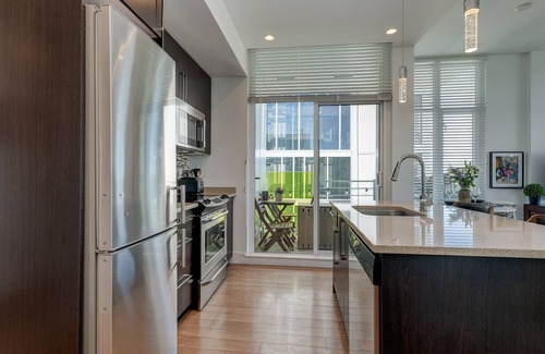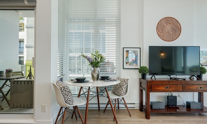 Constructed in 2013 and situated on the 10th floor of The Mondrian building, The Bohemian provides a delightful experience with a fully furnished kitchen boasting stainless steel appliances, an in-suite washer and dryer, a 50” Smart TV with apps such as Netflix and Prime, high-speed internet, and a balcony complete with a BBQ grill and fire pit!