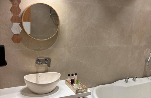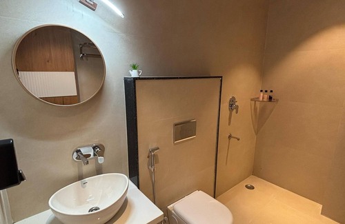 Two modern bathrooms attached with bedrooms— with a rejuvenating rain shower and the other featuring a handcrafted stone washbasin, stocked with Ayurvedic toiletries and soft bathrobes.