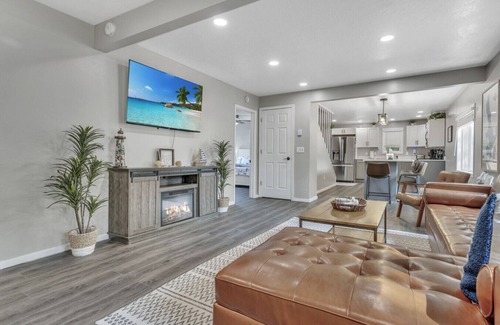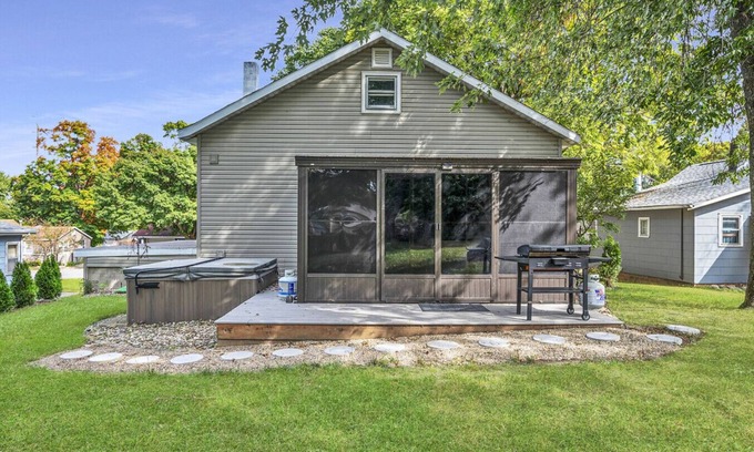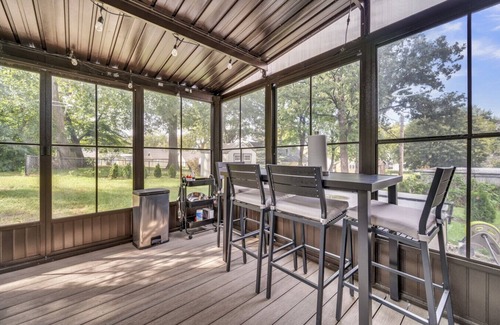 This chic lake-themed tri-level home offers private spaces for everyone in your large group. Four private bedrooms and a pull-out couch in the lower level living area offers sleeping space for up to 12. The property features a main level living room, lower level living area, fully-equipped kitchen, dining area, breakfast bar, dedicated office, three season room, gaming area, hot tub and washer and dryer. Upon entering the main level of the home you are greeted with a dedicated office that includes computer monitors, webcam, keyboard and printer. From the office you will enter the newly remodeled kitchen featuring a drip and Nespresso coffee maker and solid-surface countertops. Adjacent to the kitchen is a beautifully decorated living area with fireplace and smart TV. The main floor also provides the primary bedroom with on-suite bathroom, full length mirror and make-up desk. Off the living space you will also find the second guest bathroom and entrance to the three season room. Sure to be the most popular space of the home...this three season room offers seating, outdoor dining, smart TV and direct access to the outdoor propane grill (Blackstone) and 6+ person Hot Tub.