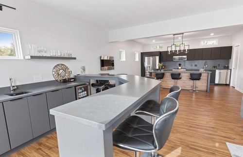 The upper-level features 2 bedrooms. The master suite has a comfortable king bed with a master bathroom featuring a floor to ceiling glass shower and a walk-in closet. The second bedroom has a queen-sized bed and a small desk in case our guests need to work. The bathroom is located right down the hallway. Our upper level features the perfect space for hosting a small gathering for family, friends or colleagues. Conversational spaces, dinning and working spaces - all of which can be configured to meet your unique needs.