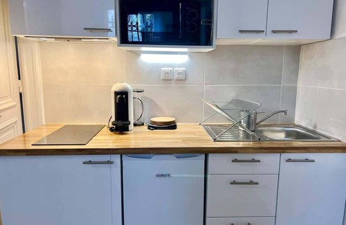 - A functional kitchen equipped with modern appliances (Nespresso coffee machine, microwave oven, induction hob).