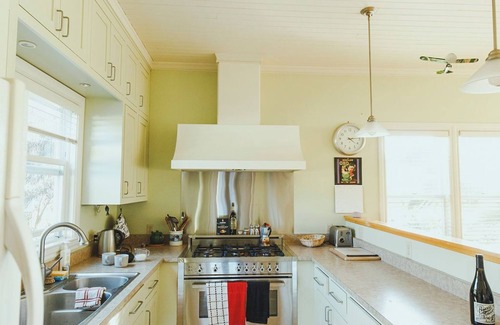 The kitchen is stocked with the not-so-usual suspects; five-burner Italian stove, electric kettle, French press coffee pot, Cafepresso machine; drawer dishwasher; fridge; plus plates, cutlery, cookware, wine and beer glasses, etc.