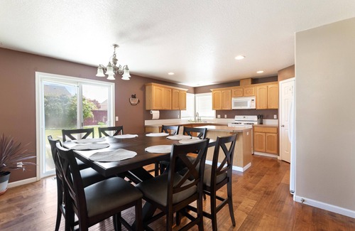 This family friendly home has 4 bedrooms, sleeps 8 comfortably. There is a large enclosed backyard for children and pets to run and play. Large living space to gather as a family or share a meal together. This house is on a quiet street, yet very close to highway access.