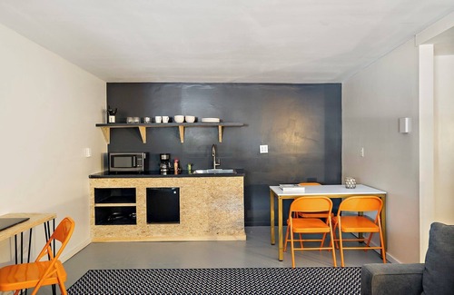 Modern Digs: custom made everything, desk with built-in bench, headboard with USB outlets, painted concrete floors, refreshed bathroom, and newly designed vanity area with sleek mirror and small fridge.