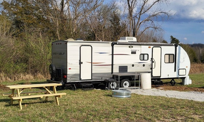 Super budget friendly. This is an older camper with minimal amenities. Has all your basics stove, shower, microwave, fire-pit, bbq pit and picnic table. Located on a 35 acre property with additional cabins. Semi private. Does include bedding and towels