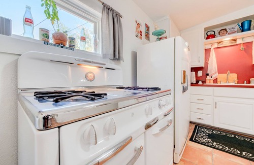 The kitchen has an antique gas oven and refrigerator, and retro dining table. For the parents visiting their TTU student, you can fit four around the table. There are 4 chairs for the table and 2 bar stools at the bar top.