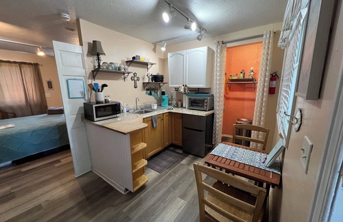 Kitchen area has a cook top that plugs in. A micro refrigerator, Keurig coffee maker, Countertop oven. A table for two.