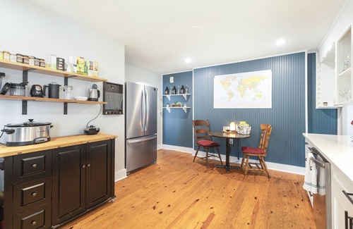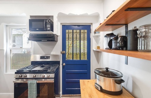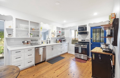 Designed with fun in mind, The Bungle House Blues features three spacious bedrooms and one bathroom adorned with musical decor and instruments available for guest enjoyment. You will find amenities that cater to your every need, including complimentary coffee, hotel-quality bath essentials, and a private fenced-in backyard complete with a stone fireplace and outdoor dining area under a majestic oak tree. This space is perfect for intimate gatherings such as pre-wedding brunches or celebratory dinners after the wedding festivities, all while ensuring your comfort and relaxation during your stay.