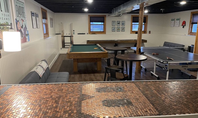 The Bunker has it all! Comfortable, clean, private, log-sided home surrounded by mature pines with plenty of privacy and parking. Front screened in porch with swinging bench, large indoor game/rec room for rainy/chilly days, fenced in private courtyard with 3-hole putting green, bags area (boards and bags included), fire pit, dining table and grill. Within a few miles of Sand Valley's professionally designed courses...Sand Valley, Mammoth Dunes, The Sandbox, and upcoming Lido. Nearby Arrowhead club has two public courses; The Lakes and The Pines. One block from Lake Arrowhead for fishing, kayaking, boating, and sand beaches/playground. A short drive to public gun range. Adams County is known for its extensive ATV, snowmobile and biking trails. Great local bars and restaurants nearby. Perfect for large family, multi-family or a bunch of friends. 1 King, 5 queens (2 queen beds and 3 fully convertible queen sofa sleepers), twin over twin bunk bed, 2 convertible full-sized futons, along with 4 twin cots, if needed. Our private, fenced-in courtyard offers a 3-hole putting green, gas grill, fire pit with Adirondack seating, dining table, bags area (boards and bags included). Kitchen is well-equipped with 16 full place settings (or 36 split up settings).