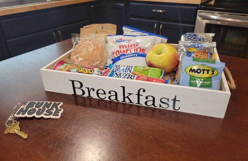 The Bunkhouse is a 2 bedroom, 1 bath cabin with a fully equipped kitchen and laundry room. Decorated in a cozy farmhouse theme with games and crafts for families and couples.