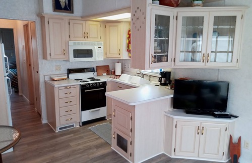 Fully furnished with full kitchen plus microwave. Dishes, utensils, coffee and coffee maker included. Full bath and shower, linens and towels. Air conditioning, ceiling fans and heating. Large front porch for morning coffee and sunset viewing. Laundry service available. Queen bed, twin sofa sleeper, TV and stereo. Outdoor grill and covered parking. It is rural but not far from the city. Fully furnished.