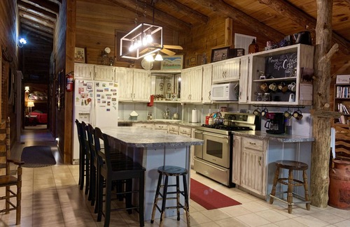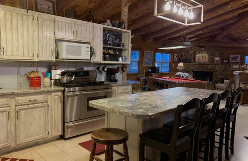 The warm and welcoming 2 bedroom, 3 bath lodge has a beautifully spacious great room with a fully equipped kitchen, a cozy fire place sitting area, a pool table, and friendly lending library for your reading pleasure. Relax on the spacious covered porch or enjoy a soak in the private hot tub. Cook outdoors on our BBQ grill (gas or charcoal) or if you're feeling adventurous there's a campfire cooking area where you can grill a cowboy sized steak or toast a marshmallow! Just don't forget your food!!! It's a long drive to the grocery store!! Steaks and/or other cuts of Chesser Ranch beef or lamb available for purchase, based on availability.