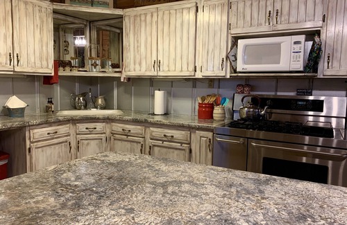 At the end of the day, the peacefulness of the ranch setting promises a rejuvenating and restful night’s sleep. The Lodge at Chesser Ranch has two bedrooms complete with a private full bath in each. The Rodeo Room sleeps 4--(1) king and (1) twin bunk bed. The Indian Room sleeps 6--(1) queen and (2) twin bunk beds. A third full bath is located in the great room, complete with a horse trough shower! We also have a laundry facility for your convenience.