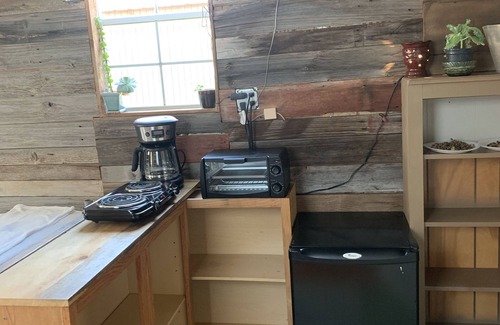 Bunkhouse is in the same lot as my country cabin it’s a smaller cabin with an open floor plan. Kitchen with cooking supplies to make coffee or a meal. Full bathroom with a standup shower. Bunkhouse is all furnished the bed is a extra large twin