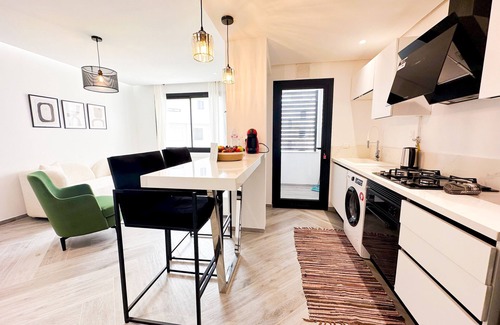 - A fully equipped open kitchen with gas stove, hood, washing machine, fridge, coffee machine, and utensils