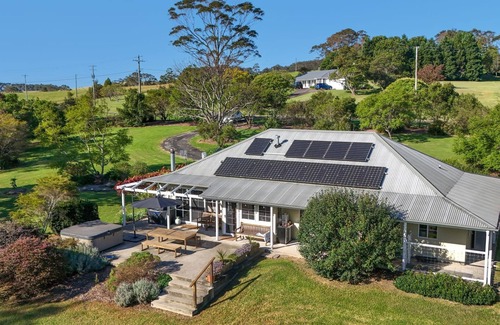 The Byres is a delightful boutique farm cottage set on 3 acres of lush lawns and manicured gardens in Far Meadow. Once a dairy farm, the property has stunning views over rich farmland and its own magnificent lawns and beautiful gardens. Quiet roads make it ideal for cycling enthusiasts and the nearby Broughton Creek and Shoalhaven Rivers are perfect for fishing and water activities. Come home and relax in the outdoor hot tub after a day of exploring the region in your Electric Vehicle, and have peace of mind that you can come home and recharge your car ready for the following days adventure.