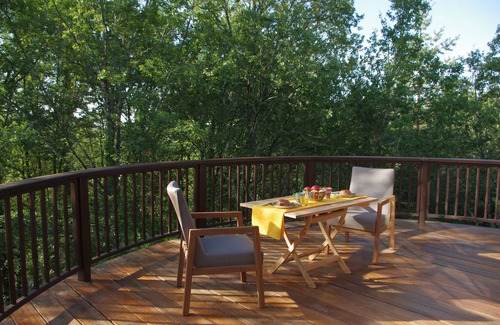 Our Treehouse Rouge-Gorge is located on the domain of Lalande-Laborie and from its terrace you have beautiful views over meadows and forest.