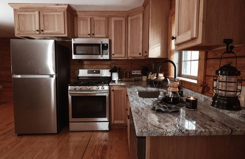 Inside, you'll find a warm and inviting atmosphere with all the amenities you need for a comfortable stay. The cabin features a fully-equipped kitchen, a comfortable open concept living room, and two bedrooms with comfy and restful beds. There is also a spacious front porch with rocking chairs and a deck where you can grill, relax, and take in the stunning views of the surrounding woods.