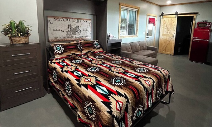 Just because you were not born in a barn, does not mean you can't stay in one! Your "neigh"bors may be just 12 feet away, but they will be the best you have ever had! If you live in the city, there may be smells you aren't used to, and the horses may bang and clang around a bit, but their kind souls and big hearts make up for it! Our 8 foot window overlooking the covered arena might even have you nose to nose with a horse at some point during your stay!