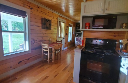 This ideal couple's retreat is a super cozy cabin located on our private property. This cabin has all the amenities of home in approx. 400 sf with an amazing amount of storage. It has a full bath and kitchen. It has a full bath and kitchen. Enjoy the private pergola patio! Dine outside after preparing your meals on the Blackstone griddle grill, enjoy sitting on the rockers while watching the deer cross the lower field, swing in the hammocks AND relax in the hot tub under the starry sky! This cabin has all the amenities of home in approximately 400 sf with an amazing amount of storage. It has a full bath and kitchen. During the day, visit the local attractions and come back to The Cabin to chill in the evenings! Located on a quiet county road, this cabin has farmhouse charm. Rock into tranquil comfort on the front porch. On cool nights snuggle up by the gas firepit table out back. The property is just minutes from Hanging Rock State Park. There you can hike, fish, mountain bike, kayak or canoe the day away. You could also tour the Yadkin Valley wineries for a fun day trip. Well within an hour you could be in Mayberry, the Blue Ridge Parkway, historic Old Salem or Pilot Mountain. The backyard is spacious for playing yard golf, darts, disk golf or corn hole. If you bring your bike or kayak, you can store it in the barn. But the real charm of this place is the quiet retreat of a place to rest at the end of fun packed day.