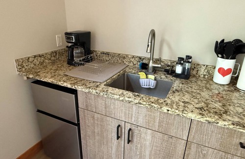 The kitchenette has a microwave/air fryer combo, and coffee/tea setup. Outside there is a private patio with views of forest and the lake, and a propane griddle for cooking. There is no oven/stove or dishwasher.