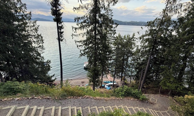 The cabinette is located about 35 minutes from Sandpoint, the last two and one half miles are gravel. This location is on the same property as the owner's main cabin. There is a shared beach area at the bottom of the stairs and also a dock. It's a great area to bring bikes, kayaks, canoes, and paddle boards. The beach is composed of flat rocks that make for great rock skipping along with swimming. The beach has spectacular views of Schweitzer and the Selkirk range. Sunsets are a must see. Beach chairs are provided. There are 99 steps down to the water, so it may not be appropriate for anyone who has a hard time with stairs.