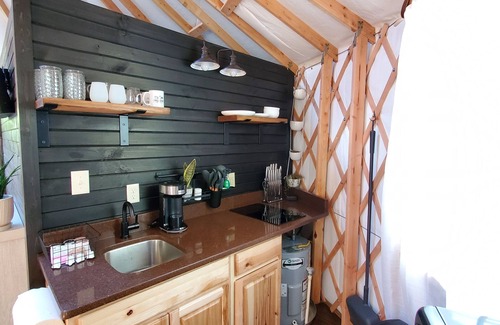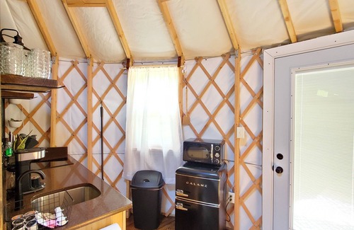 Nestled in the heart of Hocking Hills, you will find this breathtaking yurt waiting to offer you a getaway of both relaxation and recreation. You will instantly feel restored with our bright, open floor concept. You will find all you need within this 20 foot yurt, which includes a queen bed, kitchenette, and large bathroom with glass enclosed shower. Enjoy meals in the kitchenette with two cooktops, a microwave, pod coffee maker and even a small refrigerator with a freezer. We have cookware and dishes ready for you! No matter the weather, you will find comfort in our climate controlled environment, as well as a gorgeous electric fireplace to enjoy. Step outside to enjoy a night by the fire pit, love seat outdoor couch and a bistro dining set. Relax in the hot tub as you enjoy the magnificent views of Hocking Hills.