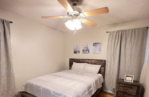 Welcome to a cute and cozy 4-bedroom, 2-bathroom home that is tucked away in a quiet neighborhood just outside of Ft. Liberty and downtown Fayetteville. This home is remodeled. It includes two queen sized beds and three full sized beds, a living room with tv, an office space, laundry room, a dining area, and a den/workout area with tv, where guests can work out or just enjoy a quiet time relaxing in front of the wood fireplace. It is a fun and enjoyable space for all.