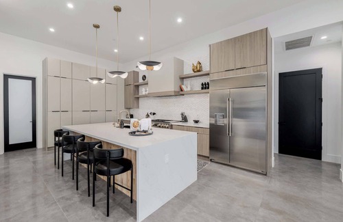 Inside, soaring 14-foot ceilings, expansive tile floors, and custom furnishings set the stage for luxury. The open-concept living area flows seamlessly from a gourmet chef’s kitchen with oversized island seating, to a stylish wall bar, to a spacious lounge with plush seating and Smart TV. Each of the five bedrooms is a private retreat, with four offering spa-like en-suite bathrooms that elevate comfort and convenience. The primary suite stands out with its generous layout and indulgent bathroom sanctuary.