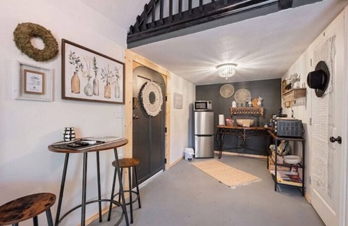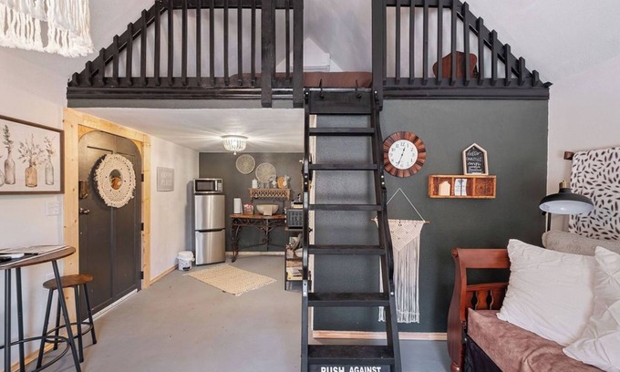 1 of 4 cabins nestled in Hidden Hill Stays, within walking distance of a food truck park and minutes away from The Rim, The Shops at La Cantera and Boerne! 350sq. ft. plus a spacious (& private -just pull the curtains) patio NOW w a hot tub! Trundle under daybed couch expands to King on bottom PLUS the King Purple Mattress up in the loft! When you stay in one of our cabins you get access to axe throwing, yoga slab, fire pit and privacy. Tucked right off Boerne Stage Road! Come hideaway with us!