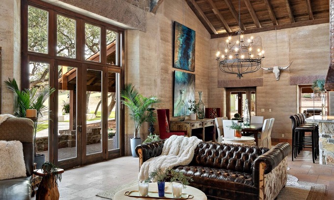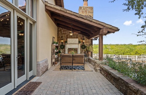 At The Carriage House, you will enjoy exclusive features designed to enhance your experience. This spacious retreat boasts four bedrooms and two loft spaces, comfortably accommodating up to 12 guests. Revel in the elegance of the living area, highlighted by soaring 35-foot beamed ceilings and abundant natural light, or prepare a feast in the chef's kitchen with ample dining space. Outdoor enthusiasts will appreciate the covered patio, outdoor fireplace, and designated ceremony area under magnificent Live Oak trees combined with breathtaking hill country vistas. Additionally, with a resort-style pool, luxurious jacuzzi hot tub, and a charming amphitheater for wedding ceremonies, the property offers multiple enchanting settings for your events.
