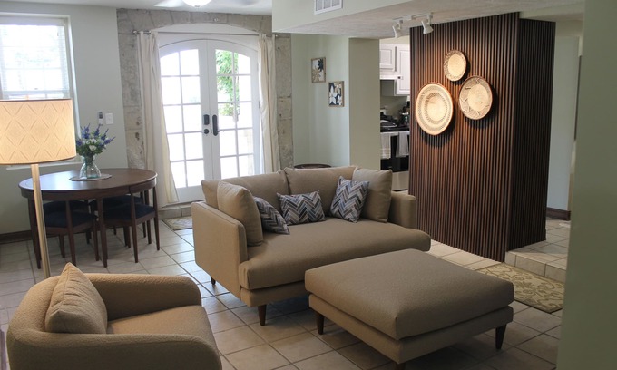 The Carriage House is one of the attached apartments to the original Denison home. It has been updated with new luxury furniture, marble bathroom countertops.