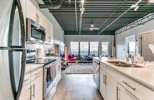 Enjoy a luxury, unique experience at this centrally-located Flat in East Village next to Downtown Des Moines! Brand new fitness center!