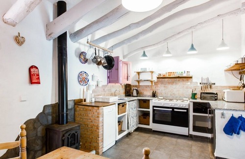 The stylishly furnished indoor area features rustic furniture, to which some modern touches have been added. This guarantees you and your beloved ones will make the most of your holidays in the province of Almeria. The main room is the lounge space, equipped with two sofas and a wood-burning stove; from here, you can access the villa's two bedrooms and the kitchen. The latter is equipped with the essential appliances and a dining table, around which the whole family will gather and share their meals.