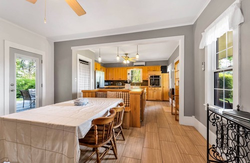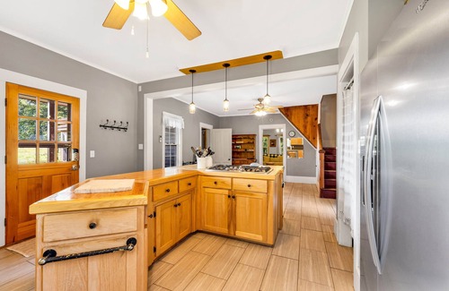 The house is 110+ years old and has been renovated throughout the years. The kitchen has been newly updated and is equipped for any cooking/dining needs. The master bathroom has also been updated and includes a whirlpool tub. There is a lot of space for living and dining. The living room includes a fireplace and entertainment center. The Cass House is ideal for families and small groups. Overall, the house is very charming and inviting space with lots of natural light to enjoy with friends and family.