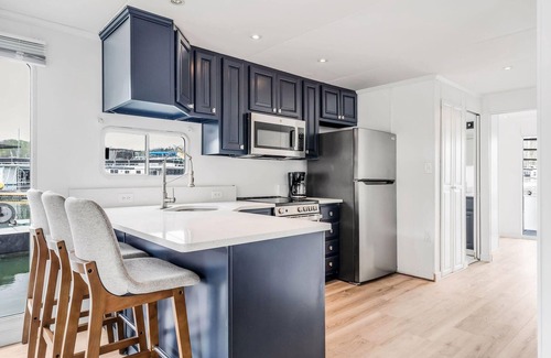 A second watercraft is required to stay on the lake. Our 53-foot houseboat features three bedrooms and one full bathroom, along with a fully equipped kitchen, a living room area, and a dining table. In addition to the three bedrooms, there is a sleeper sofa for extra sleeping space. The front open area includes a gas grill and an outdoor dining area. On the rooftop, you'll find a covered dining area and a lounge space. For added fun, there is a waterslide that extends from the rooftop down the back of the boat.