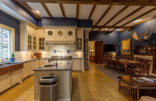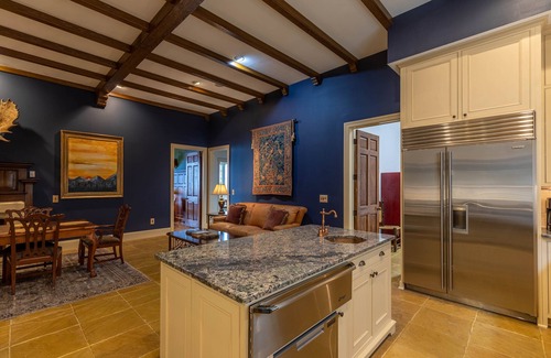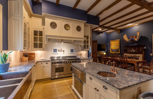 Back inside, off the ballroom is the formal dining room, with another beautiful chandelier, a long dining table, and 10 plush chairs. There is a second dining area by the kitchen, with a table for 8 next to a decorative fireplace and the walk in pantry with ample storage space. The showstopping kitchen is a chef's dream, featuring exposed beams, stone tile floors, yards of blue granite counters, professional grade stainless steel appliances including a 7-burner gas range and a Subzero French door refrigerator, double ovens, pot filler, 3-basin copper sink, custom cabinets, and all the appliances, equipment, and dishes you'll need to create delicious meals.