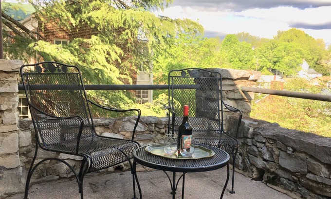 An upstairs 1 bedroom apartment, sleeps 2, with sitting room, fully equipped kitchen, Queen bedroom, bathroom with shower, terrace overlooking gardens, WiFi, Air Conditioning, off street parking, is 1 block from our quaint downtown shops, museums and restaurants, and a convenient 4 block walk to the colleges. Hiking (Woods Creek Trail, Chessie Trail) and biking are popular activities in the area. The nearby Maury River has great angling opportunities. https://lexingtonvirginia.com/events has a wealth of events taking place locally.