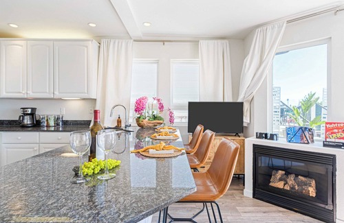 While you're here, you can enjoy all the comforts of home and more, including a full-sized refrigerator/freezer and an oven, as well as a stovetop and a dishwasher. Other amenities include towels, kitchenware and utensils, a dining area, and an ironing board.