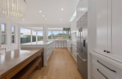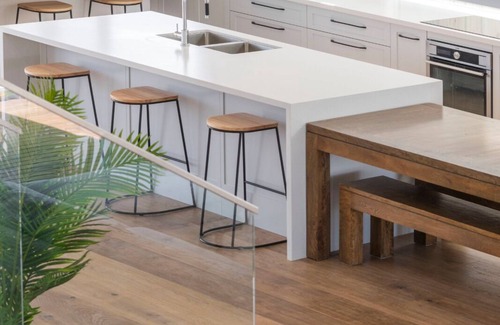 This designer beach house is located in the tranquil Catherine Hill Bay. The house is divided into two areas - the four bedroom main house & attached one bedroom self-contained apartment, allowing large groups to stay together with their own private spaces.